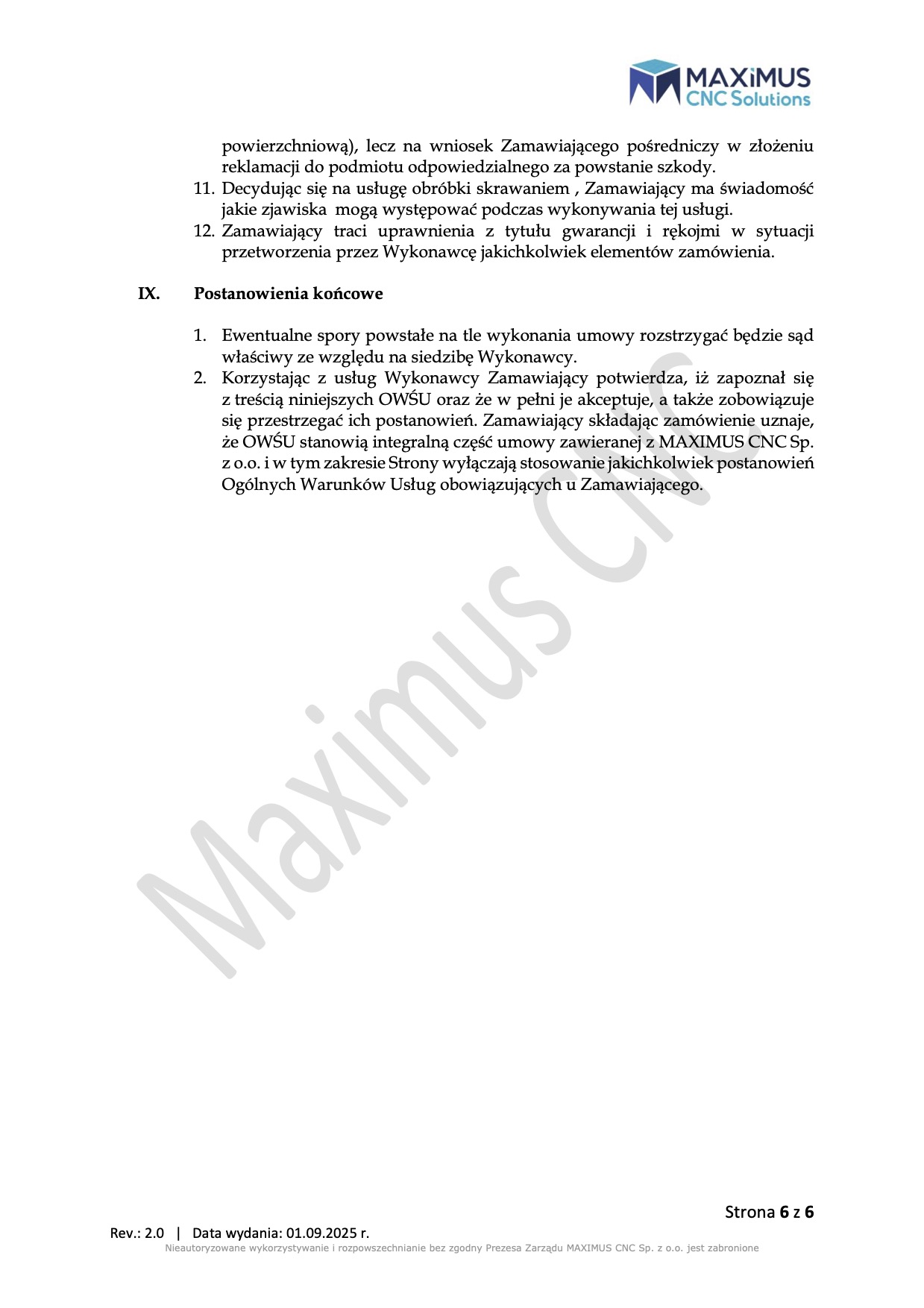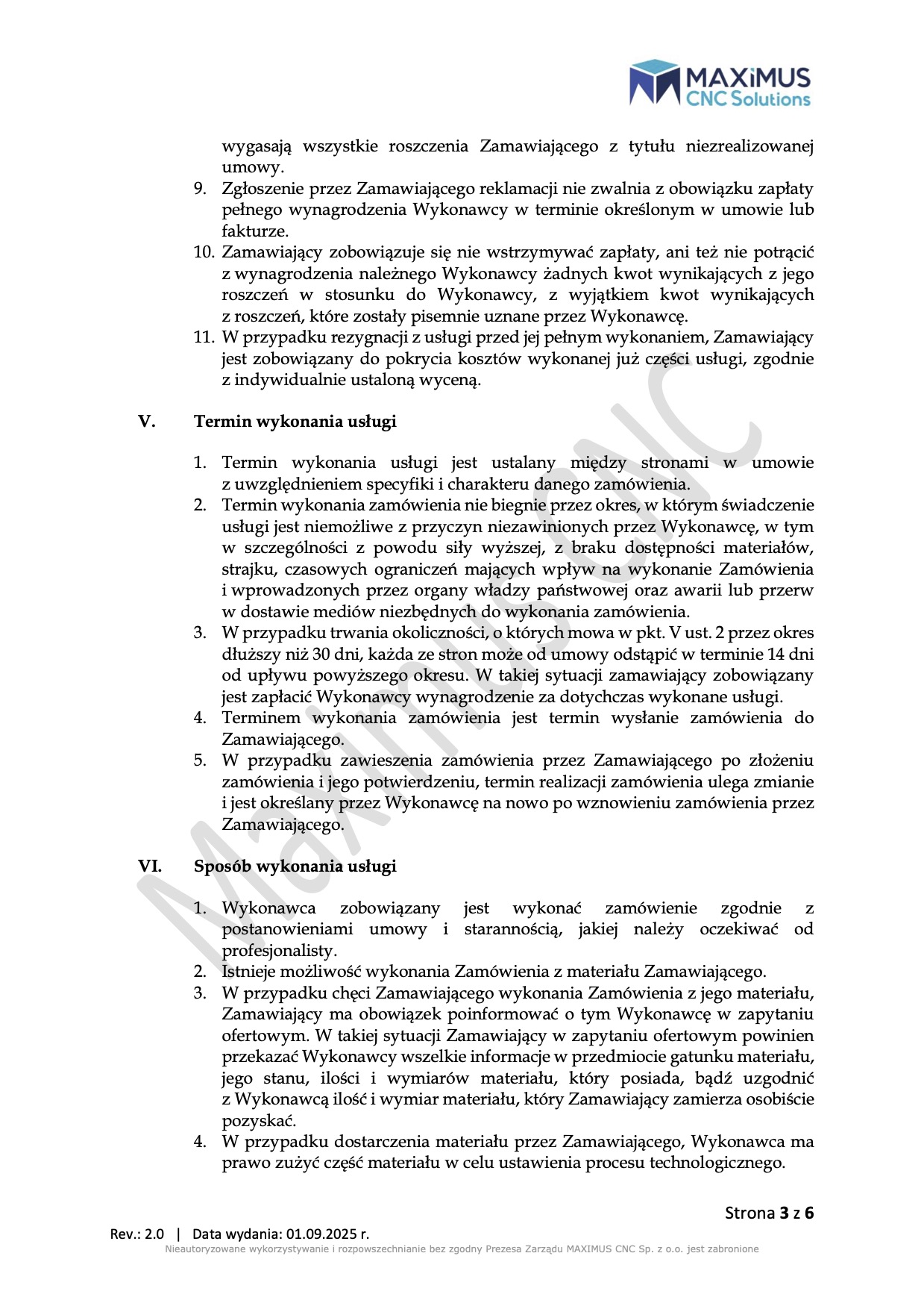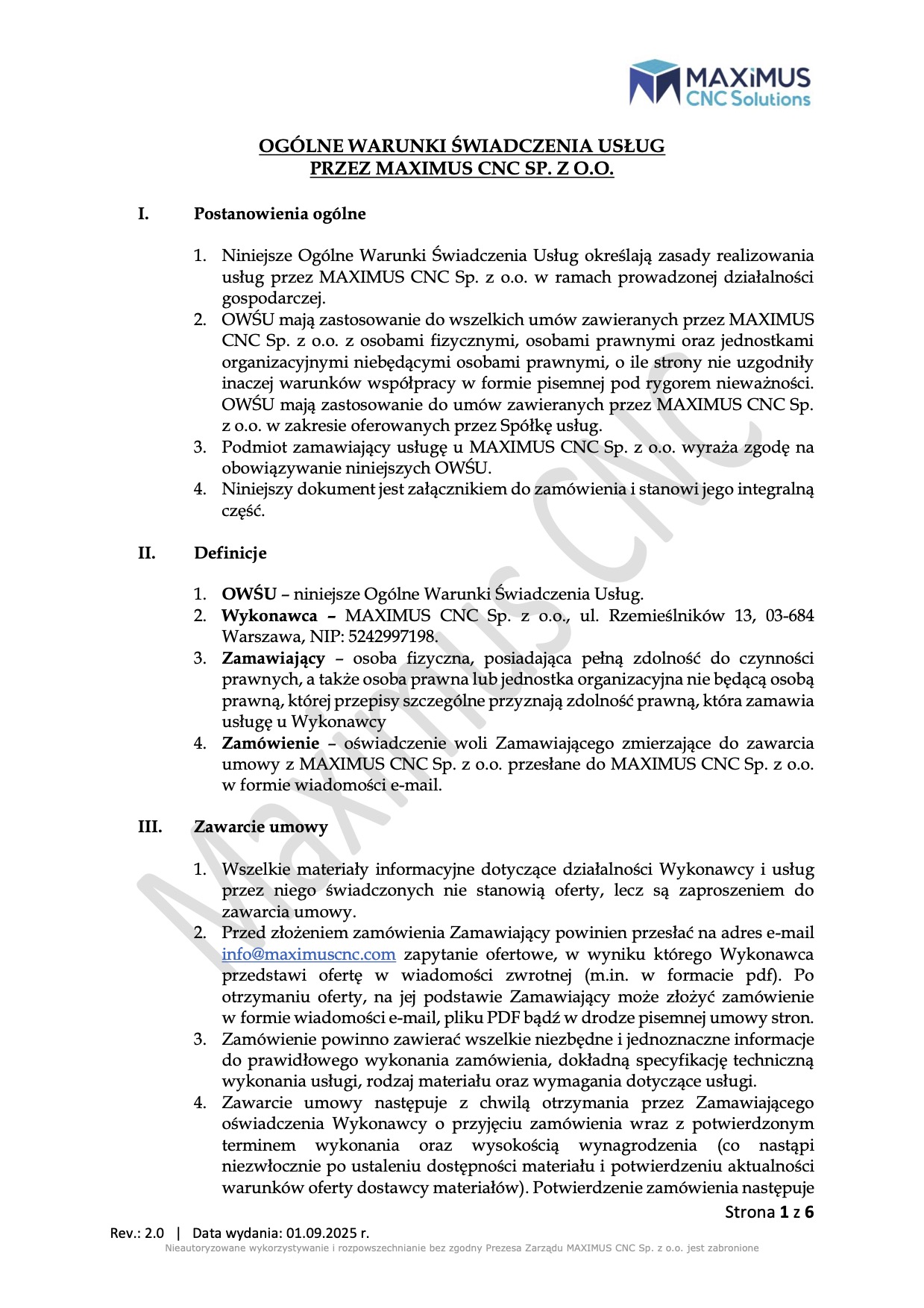 Ogólne Warunki Świadczenia Usług przez MAXIMUS CNC